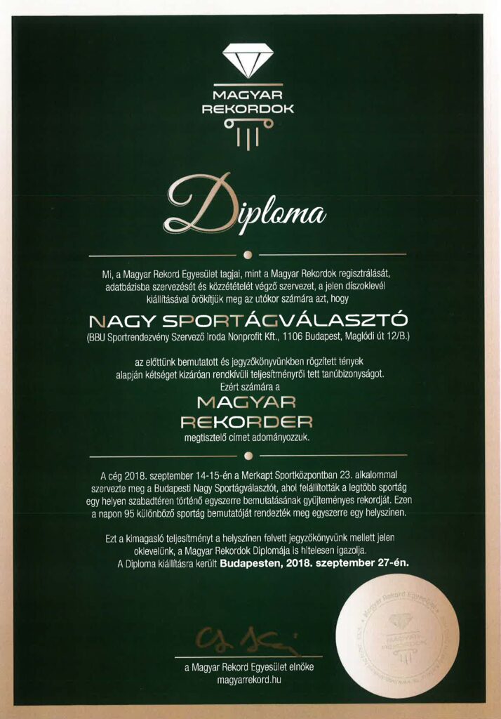 A Nagy Sportágválasztó magyar rekordot állított fel 2018-ban a Merkapt Sportközpontban, ahol szeptember 14-15-én 23. alkalommal rendeztük meg az ország egyik legnagyobb sportfesztiválját.